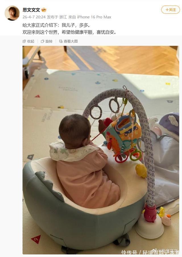 4月7日,脱口秀演员@思文文文发文:“给大家正式介绍下:我儿子,多多。欢迎来到这个世界,希望他健康平顺,喜忧自安。”并晒出了宝宝背影照。 她在自己博客节目里透露已经再婚,介绍丈夫是不愿意透露姓名的人很nice的普通人。思文透露孩子是意外有的,自己理解是一个命运的安排。 此前,思文与程璐在2020年7月宣布离婚。 2020年,《吐槽大会》《脱口秀大会》首席编剧、脱口秀演员程璐在微博发文宣布已经离婚,他写道: “我和思文经过友好协商,确实已经办理了离婚手续,从夫妻做回了兄弟。我俩一直是生活密友,事业伙伴,今后也将一如既往地支持彼此成长。作为喜剧工作者,希望我们带给大家的是欢乐,而不是话题。婚姻不在,兄弟还在。” 【@江南都市报、梨视频、当事人社交账号、现代快报】